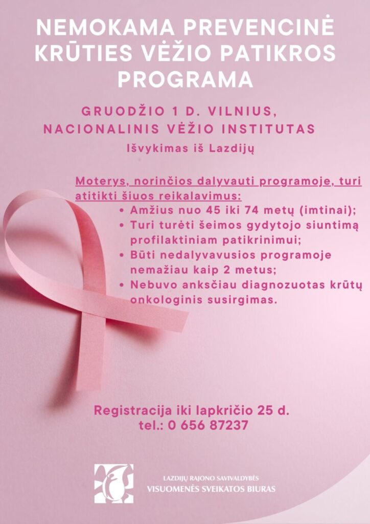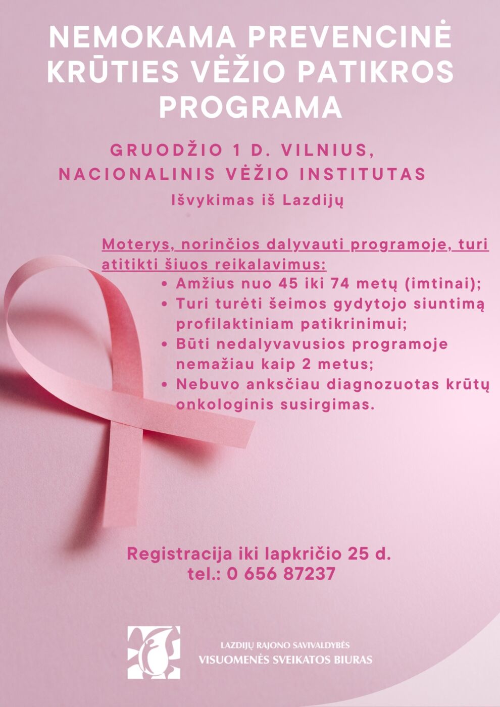 Lazdijų VSB direktorė Simona Jasinskienė teigė, jog Krūties vėžio prevencinė programa skirta moterims nuo 45 iki 74 metų (imtinai) kartą per 2 metus atlikti mamografinį tyrimą.
