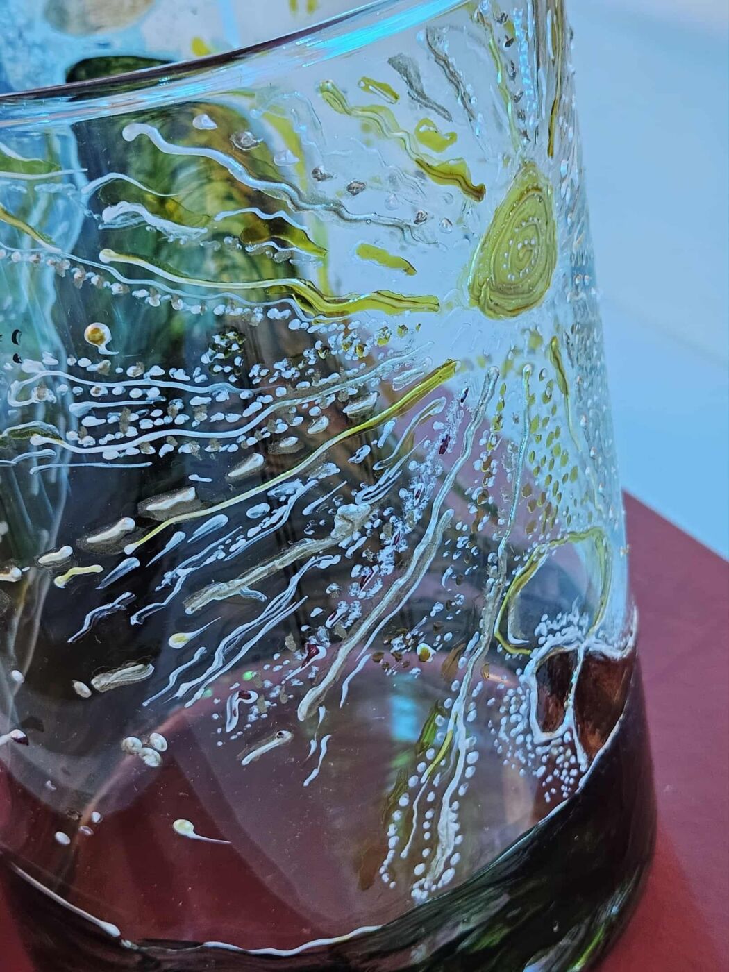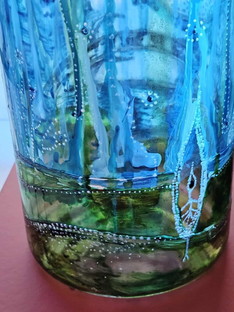 Bibliotekos langų ekspozicijoje eksponuojami vitražai, o šalia jų – spalvoti cilindrai, mokinių sukurti pagal M. K. Čiurlionio kūrybą kartu su dailės mokytoja Jolita Jasevičiene.