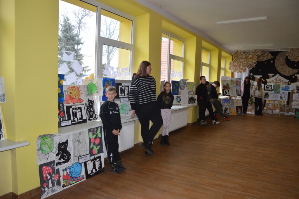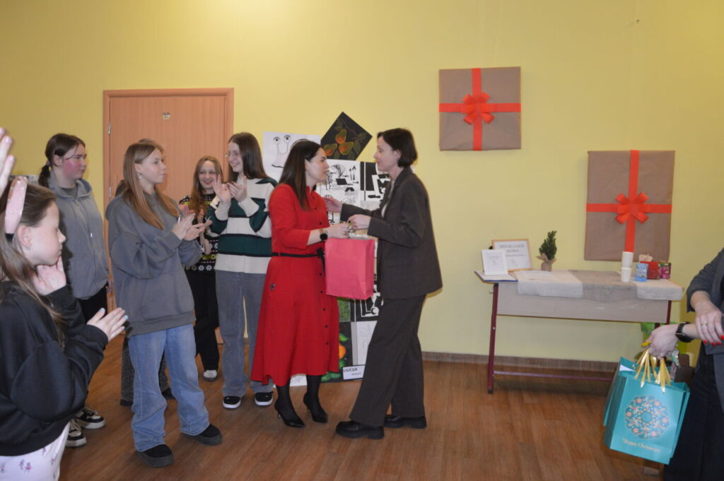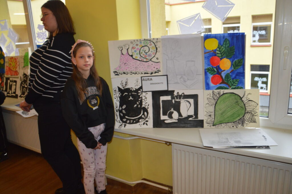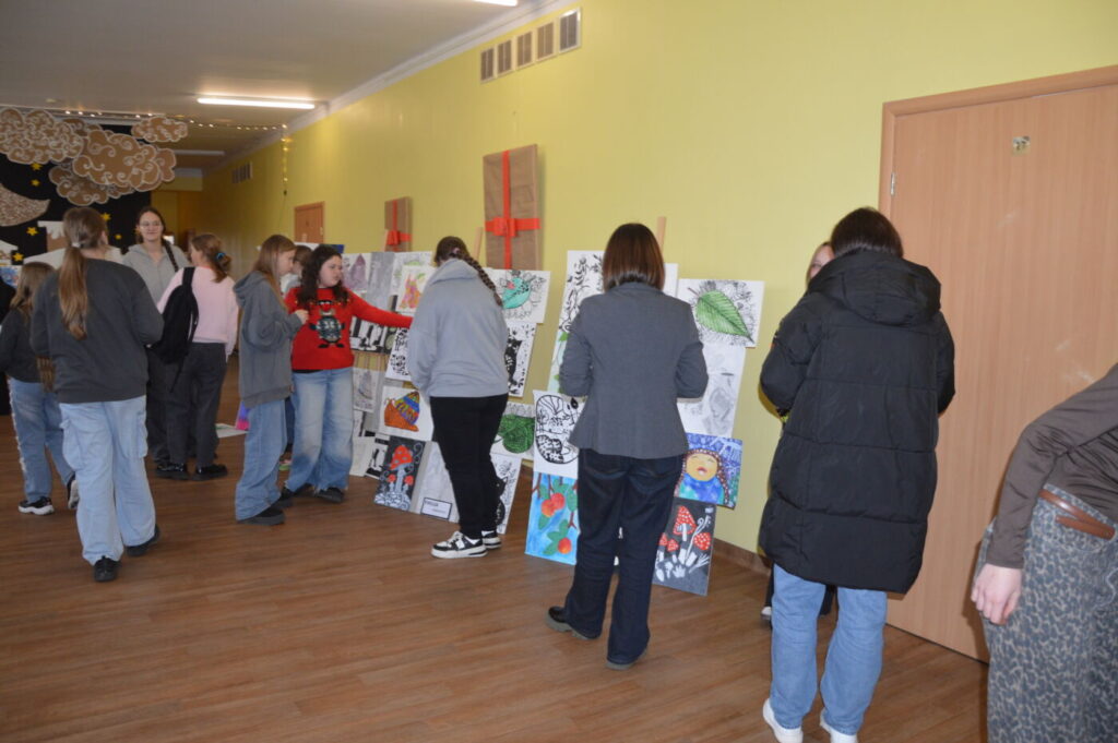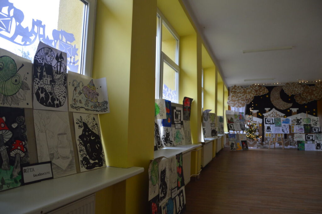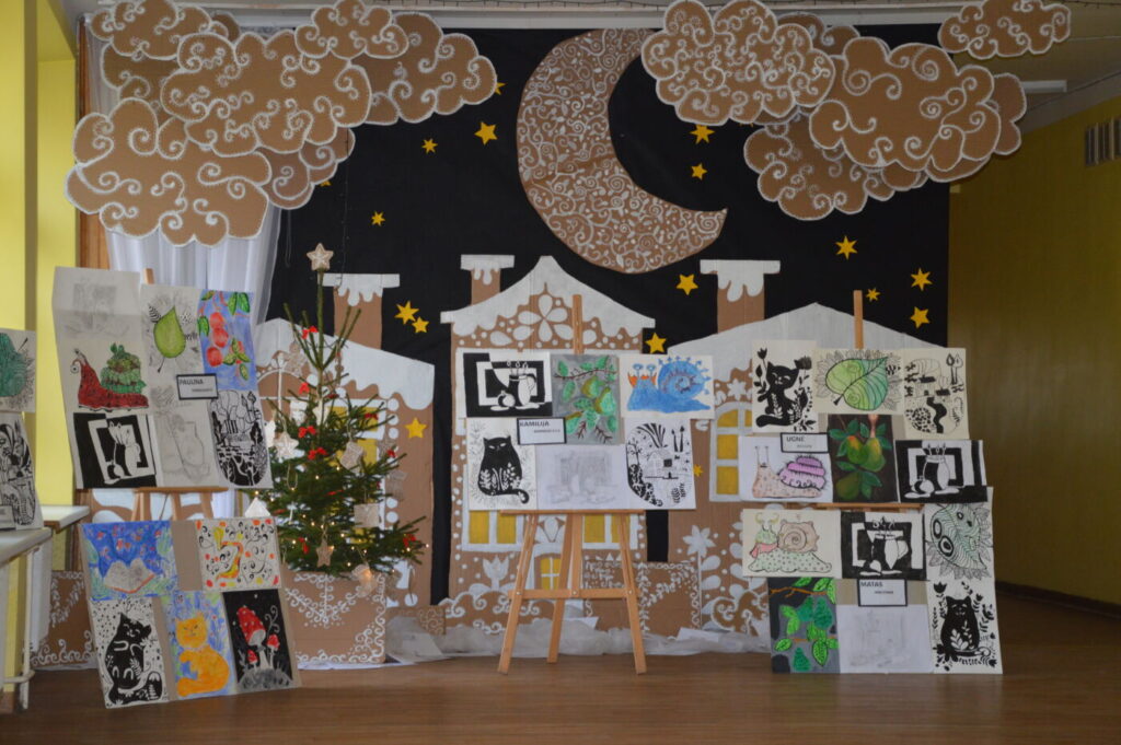 Prieš šventes dailės kabinetas virsta tikromis dirbtuvėmis – mokyklą puošia vaikų kurti elniai, nešantys laiškus Kalėdų Seneliui, langai pilni skubančių šventinių personažų.