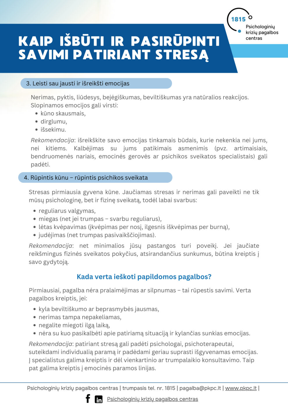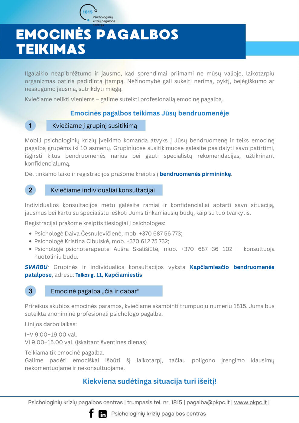 Jeigu emocinė įtampa tampa per didelė ir reikalinga skubi parama, kviečiame kreiptis telefonu: