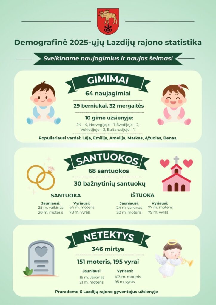 2025 metais Lazdijų rajono savivaldybėje įregistruoti 64 naujagimiai: 29 berniukai ir 32 mergaitės, taip pat atkurti 3 gimimo įrašai. Iš visų įregistruotų gimimų 10 kūdikių gimė užsienyje: Jungtinėje Karalystėje – 4, Norvegijoje – 1, Švedijoje – 2, Vokietijoje – 1, Baltarusijoje – 1.